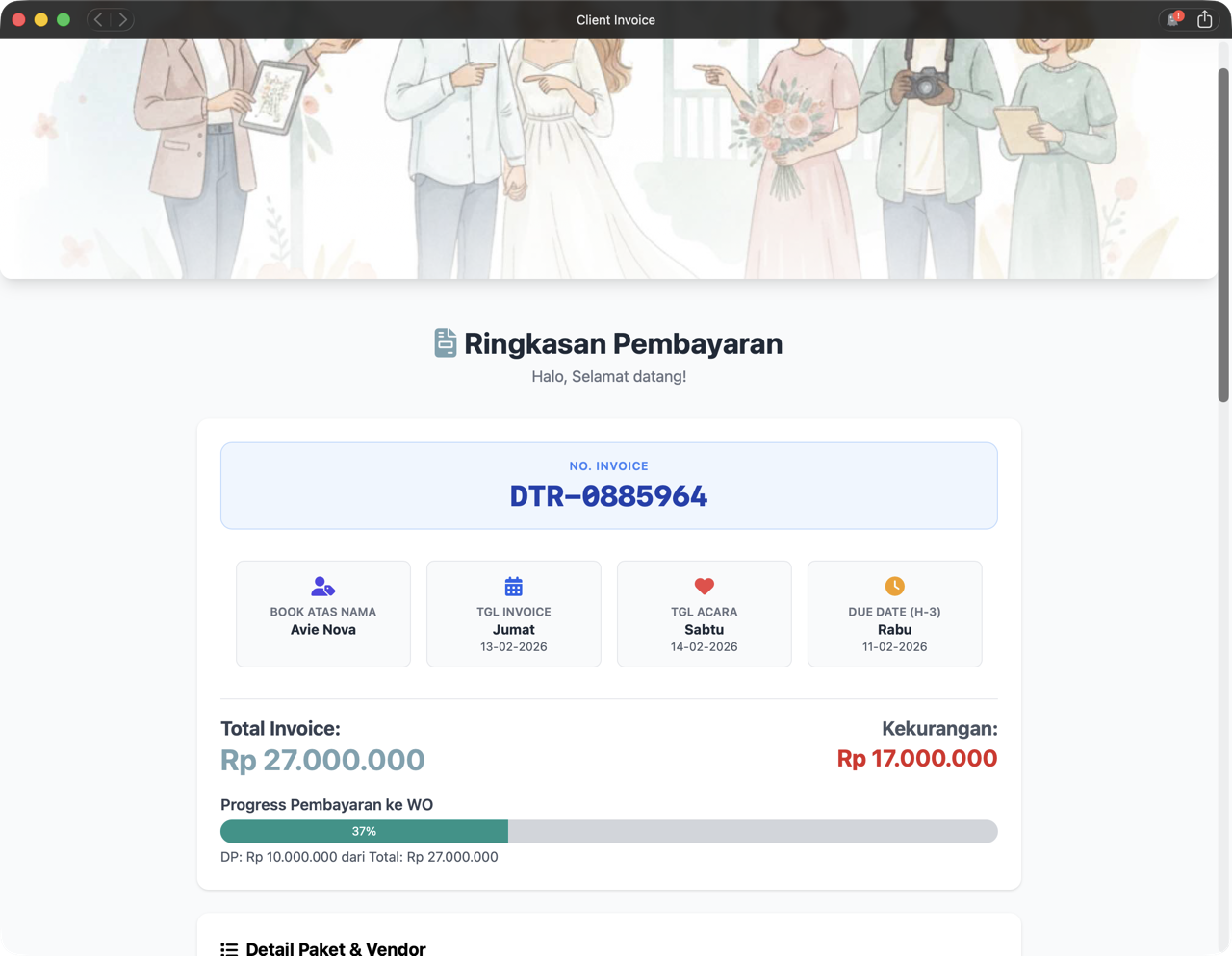 Client mendapatkan tautan khusus untuk memantau sisa tagihan mereka dan melihat daftar vendor mana saja yang sudah dibayar oleh WO. Tidak ada lagi tanya jawab yang mencurigakan.