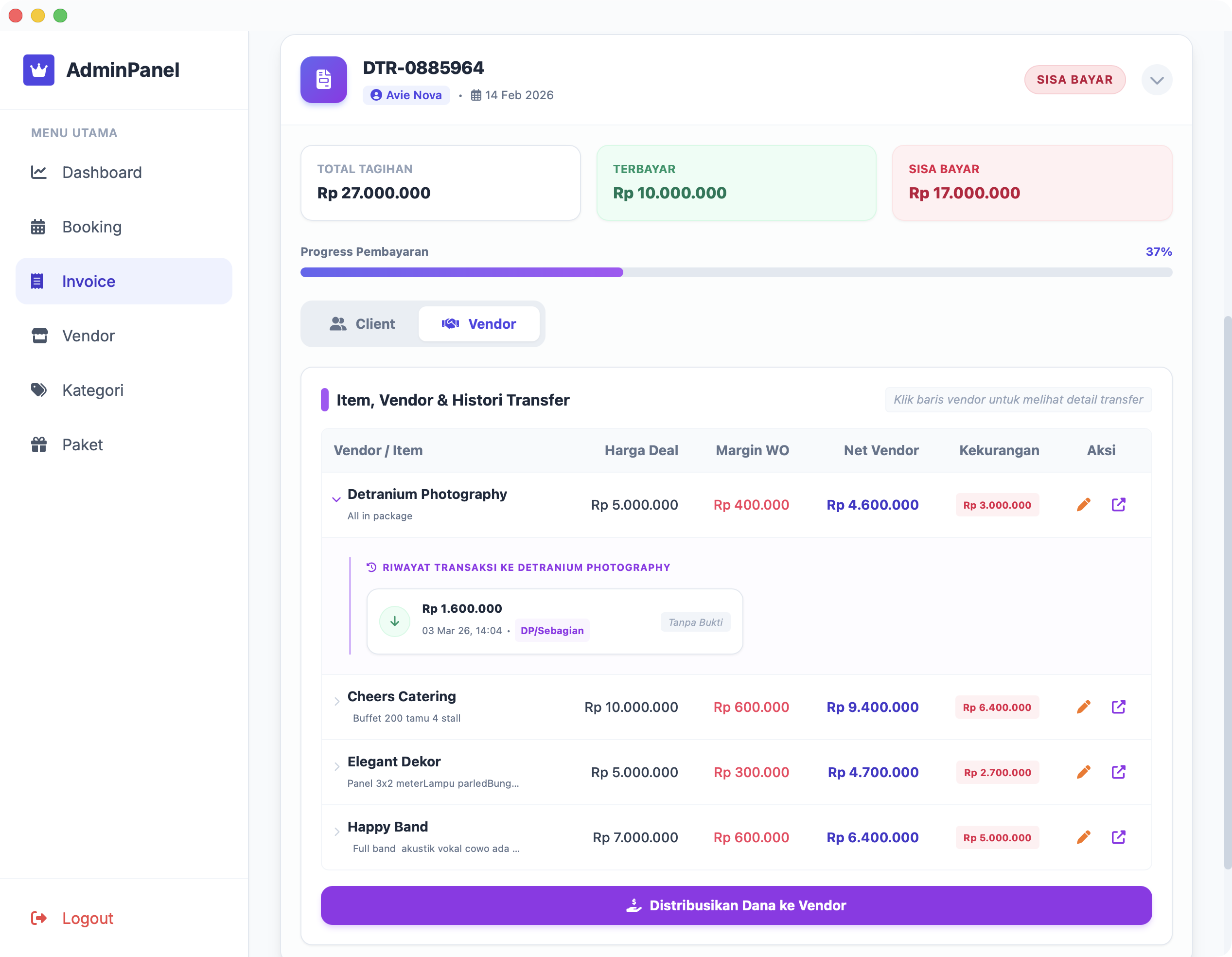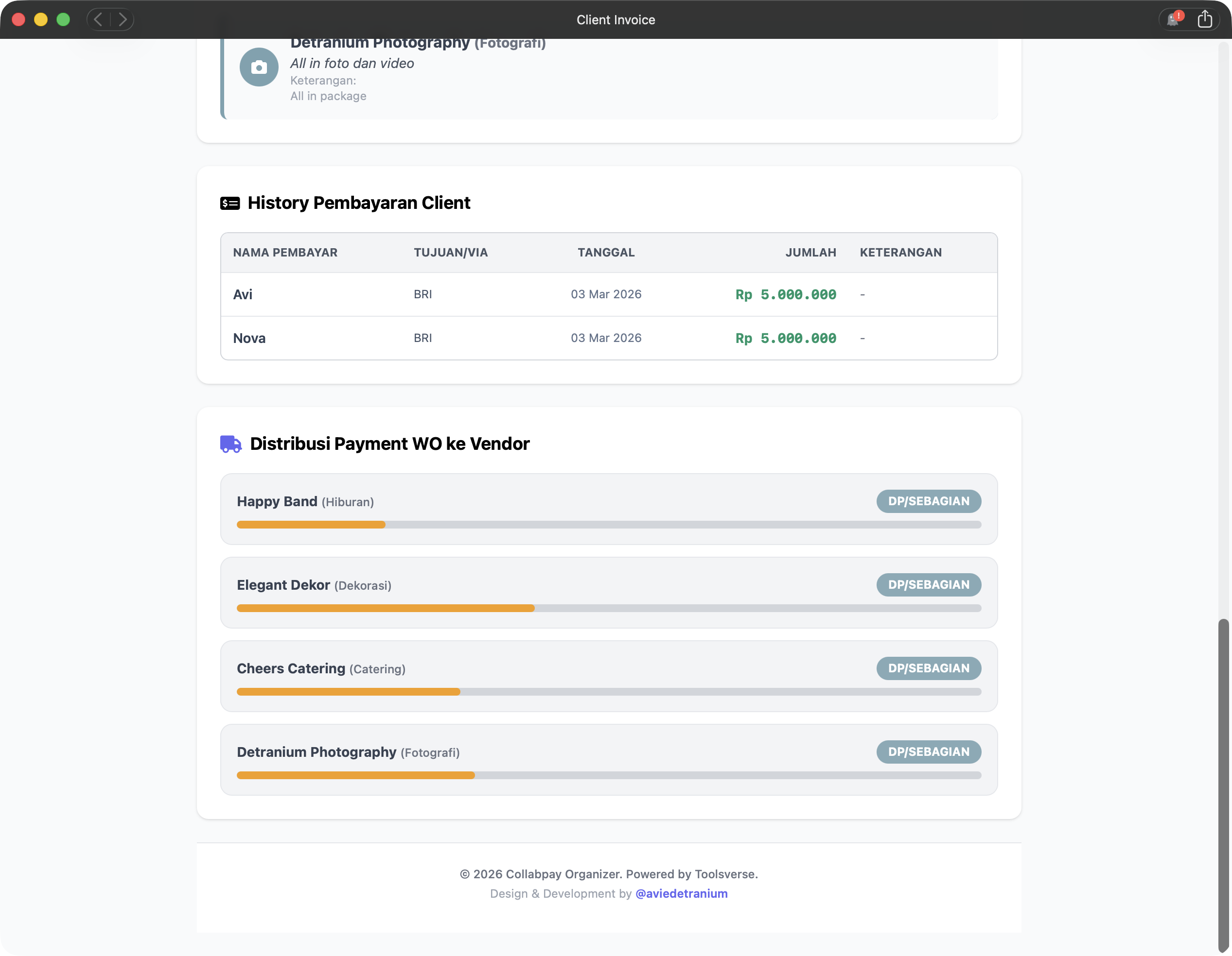 Client dapat melihat secara real-time apakah pembayaran yang mereka kirim ke WO sudah diteruskan ke Vendor (Catering, Dekor, Fotografer) atau belum.