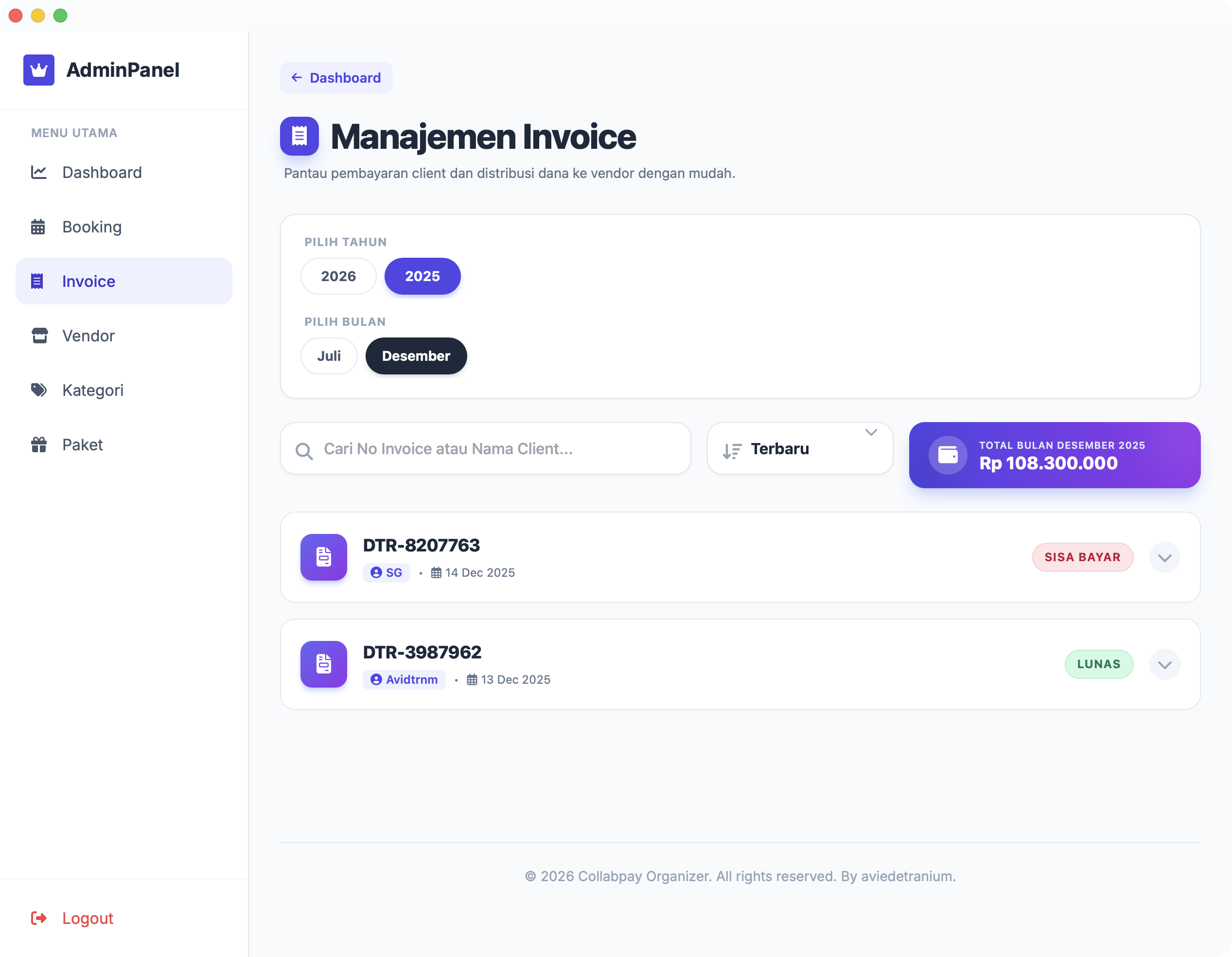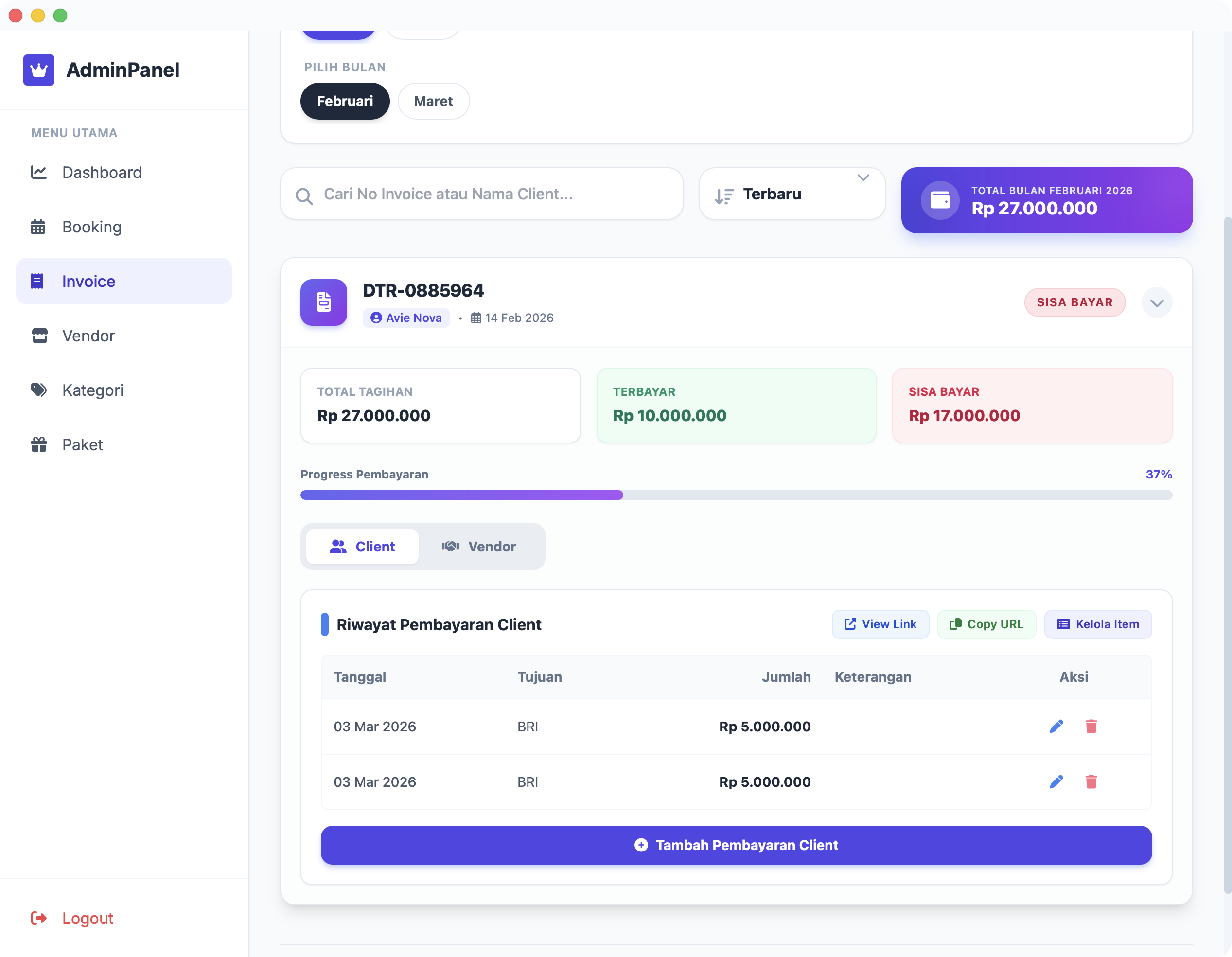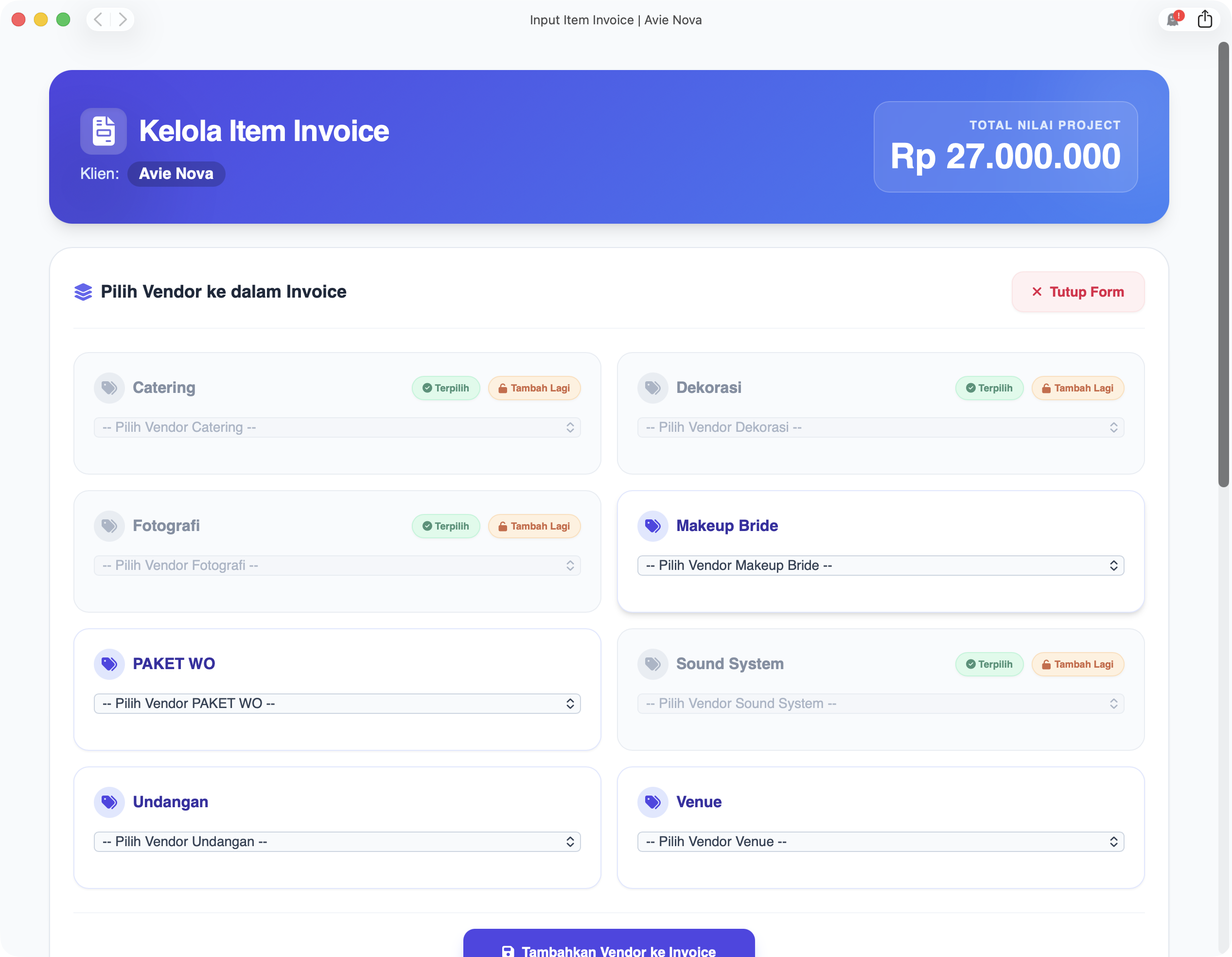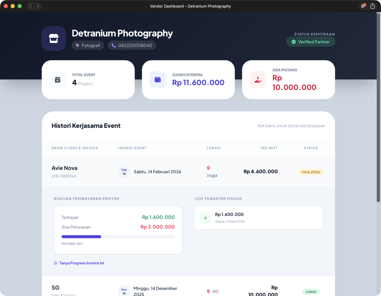 Vendor memiliki panel untuk mengonfirmasi penerimaan dana, sehingga Client yakin tidak ada "uang nyangkut" atau penggelapan di sisi WO.