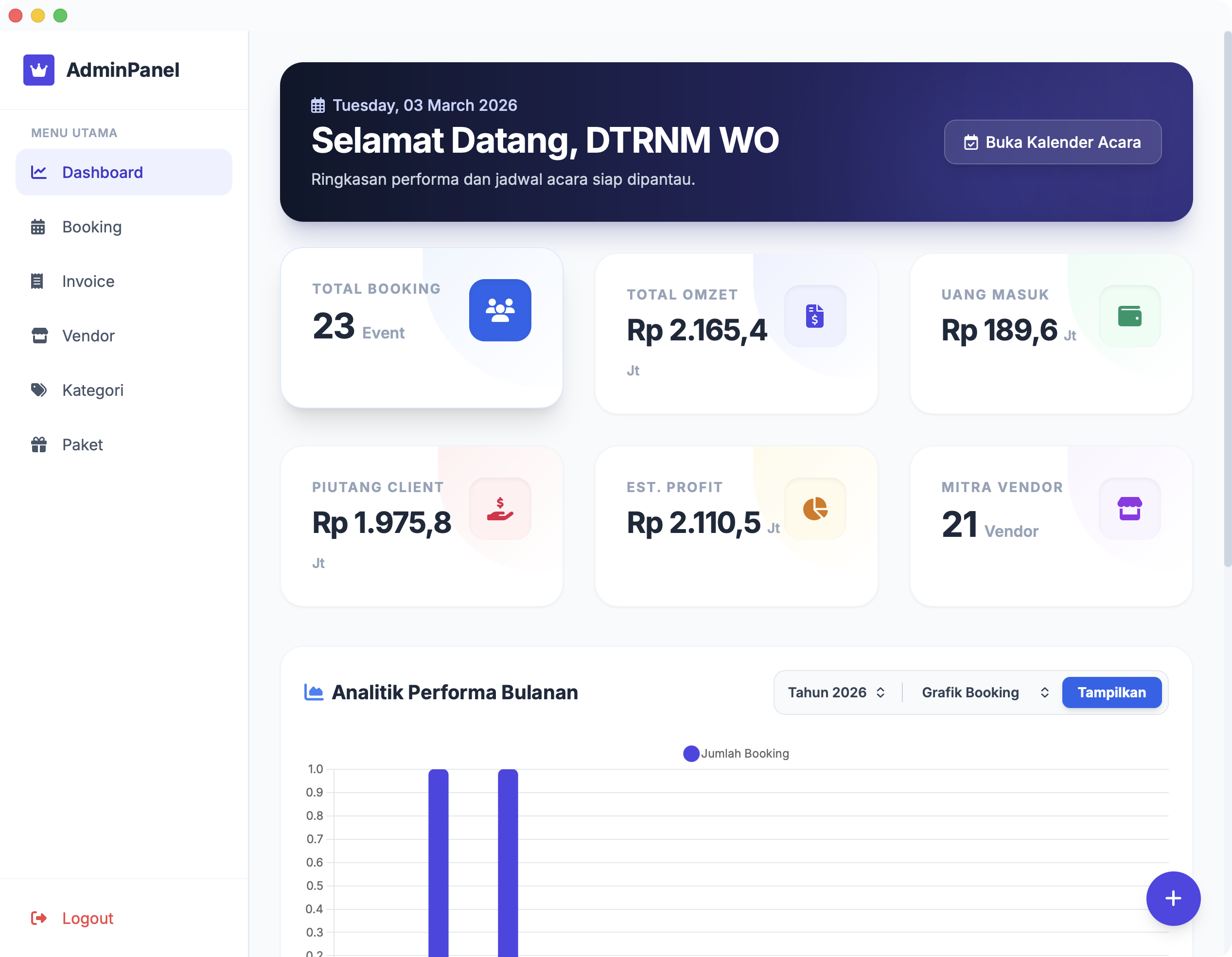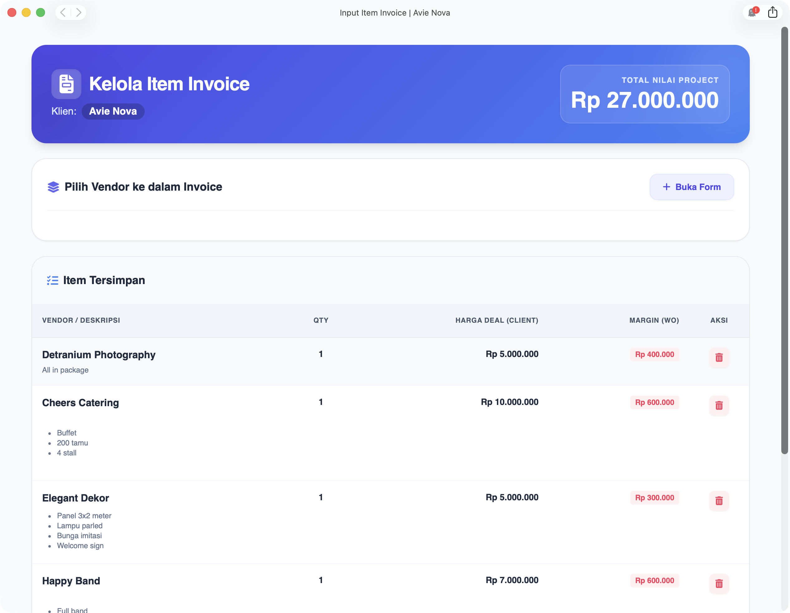 Hentikan spekulasi penggelapan dana. Berikan ketenangan total bagi Client dengan sistem yang memantau aliran dana dari tangan Client ke WO, hingga terdistribusi aman ke setiap Vendor secara real-time.